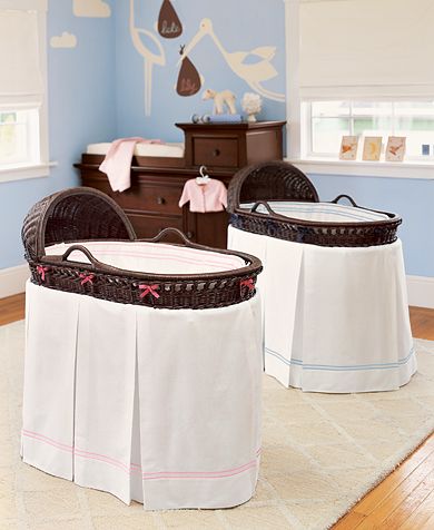 深的原木色睡籃、純白的織品點綴著與籃子相呼應的粉藍粉紅條紋,